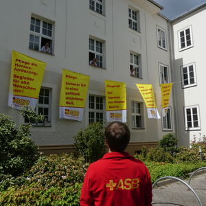 Es geht grundsätzlich um Anerkennung und Wertschätzung eines wichtigen Berufes. Und dazu gehören eben auch eine tariflich geregelte, angemessene Vergütung und vor allem ein besserer Personalschlüssel, der sowohl darauf abzielt, mehr Zeit für die zu Pflegenden zu haben und der gleichzeitig gewährleistet, dass die Vereinbarkeit von Familie und Beruf auch in Urlaubs- und Krankheitszeiten gesichert werden kann. Darauf wollen wir mit den Stoffbannern hinweisen.